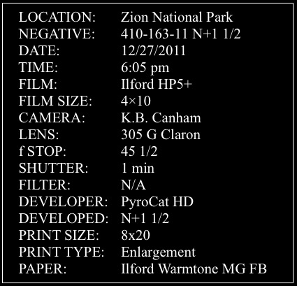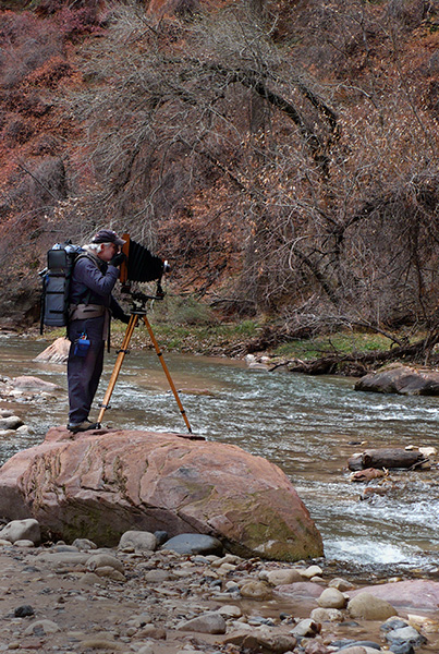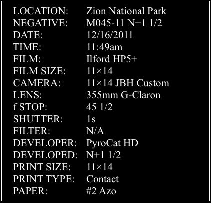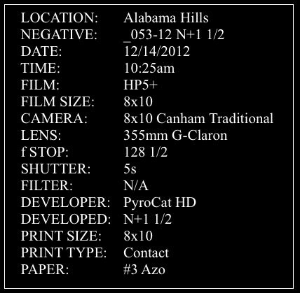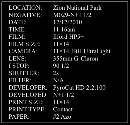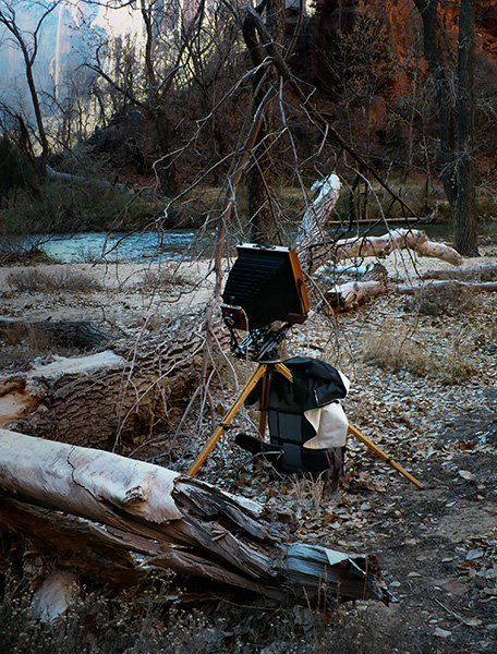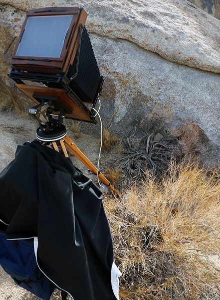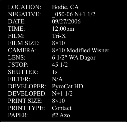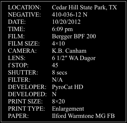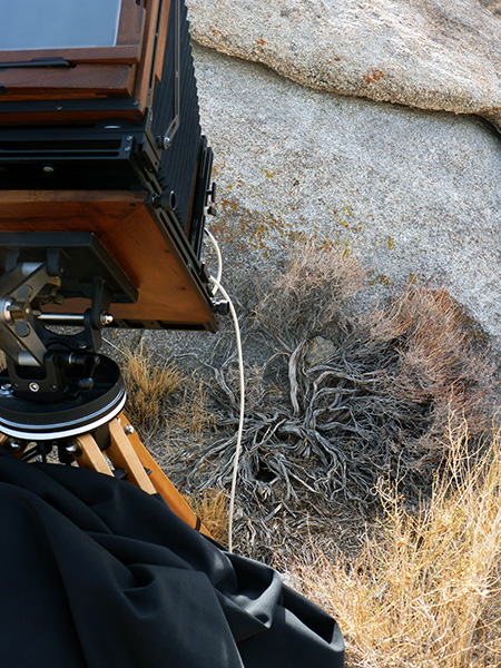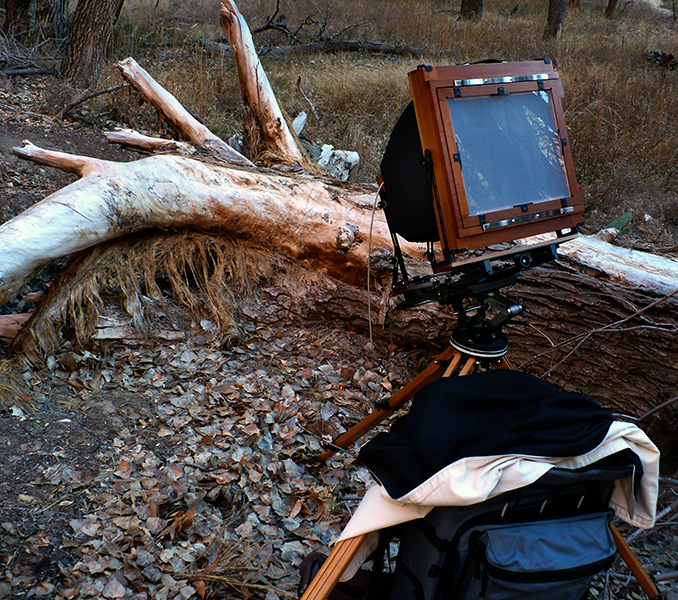 I was photographing with my 4×10 and knew that depth of field would be an issue with this photograph. To frame the image the way I wanted it to appear on my ground glass, I would need a fairly wide lens and the bellows racked out. The lens that I chose was my Schneider 210 Apo Symmar. By the time I got the image in focus, the bellows was extended 18 ½ inches. Since the 210mm was an 8 ¼ inch lens, this meant that I would