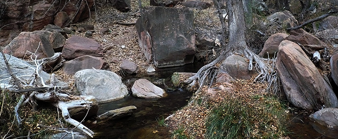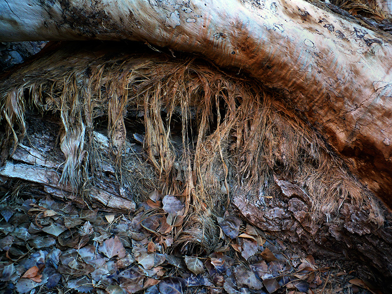 We’ve photographed a lot in this area of Zion. It is one of the more popular spots to hike. Each year there are more fallen trees and branches. These trees are left where they fall to return to the soil. I had been looking around for close detail shots when I noticed a curled leaf at the base of this fallen tree. It was 11:56 am and the light was fairly harsh.