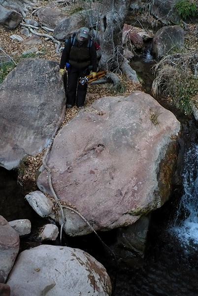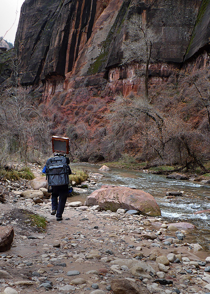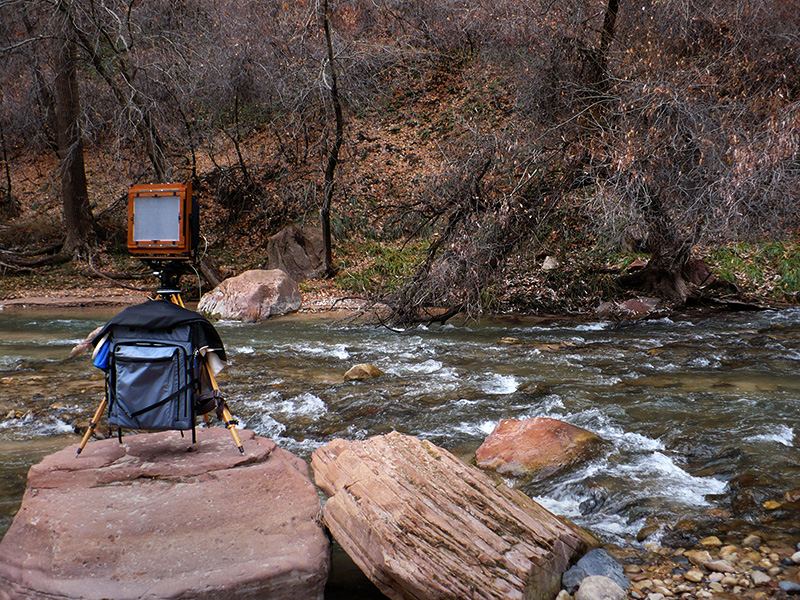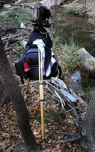 I carry a 22” reflector in my backpack for situations just like this. By using the black side of the reflector, I was able to shade the entire subject area that I was photographing. This smoothed out the lighting. The meter read 15 seconds but after I factored in the bellows extension, the exposure was adjusted to f64 @ 17 seconds.