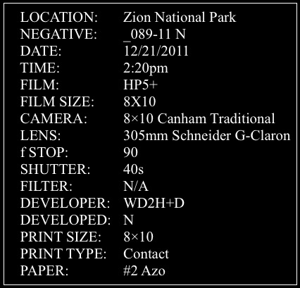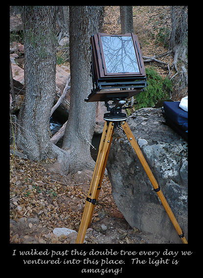 The thing you have to keep in mind is, if you do not try, you are certain to fail. I finally decided to take a stab at the double tree with the cascade in the background. I chose a moderately wider than normal lens for the 8×10, hoping I would be able to get the depth of field I needed. The Schneider 305mm G-Claron is one of my usual lenses that I carry with my 8×10. The light was incredibly beautiful. I can’t describe how it made things look, other than it was coming from behind the camera, created by the sun reflecting off the high canyon wall that faced basically southwest. I knew I had to expose the film once I got the camera in place. What I saw on the ground glass was exactly what I wanted. . . there are those times you just know. I metered and exposed. . . with fingers crossed.