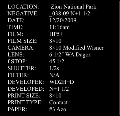 Since there is no way to explain an abstract, other than the When, Where & How, here is what I can say. This was from a trip to Zion National Park in 2009. The image was made along the lower portion of Clear Creek. It was a sunny day, 28 degrees F. . . perfect working conditions. I know I had seen this formation before, probably from being in that same area the previous year. There are things that tend to only register in the subconscious. I find that it may take several trips to an area to fully explore its potential. That is why we keep going back over and over. There is little else I can explain other than the pertinent data below. Enjoy!