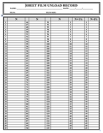 When reloading becomes necessary it is important to be able to sort the exposed film into groups that require the same developing time. We have printed sheets for unloading film. When it comes time to reload, we go through our audio notes and record the film holder numbers into columns that denote the development of each sheet of film. Once we have the sheet filled out, it is just a matter of locating the holders and arranging them in piles before unloading.