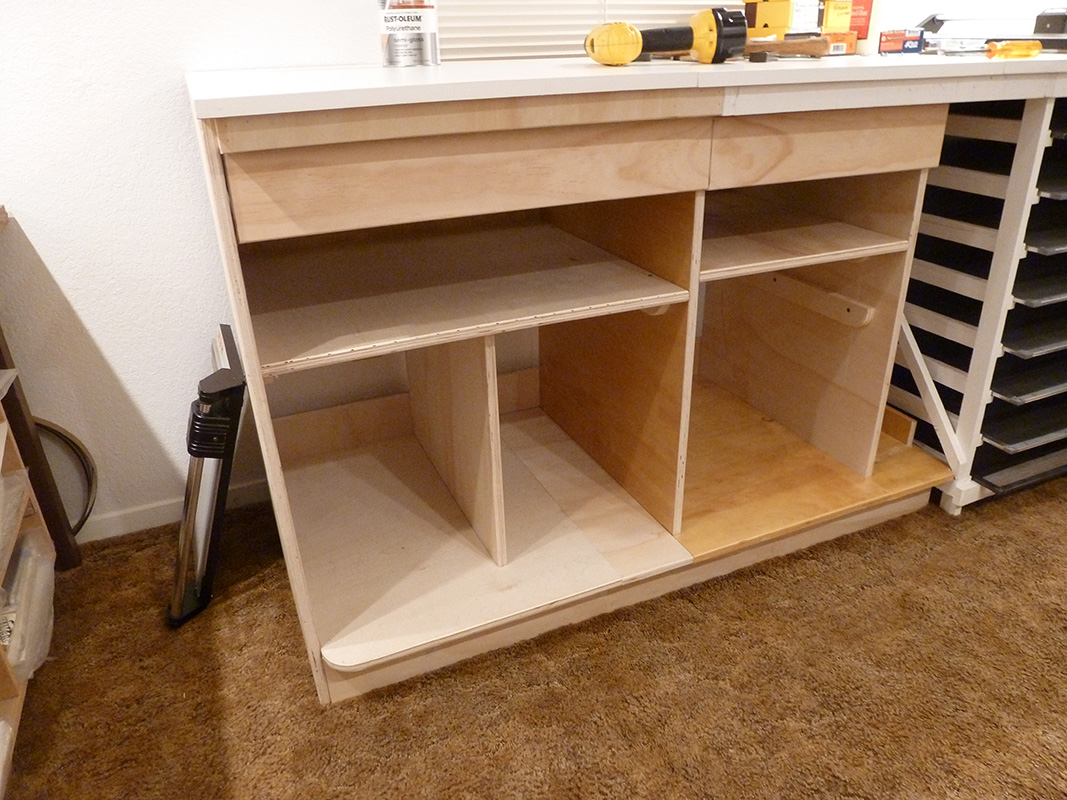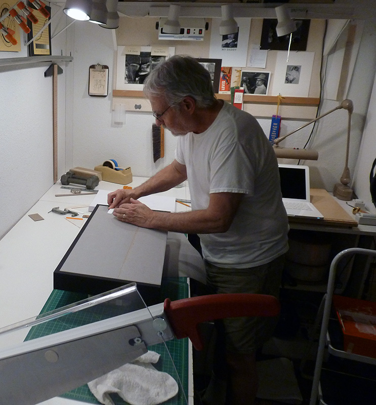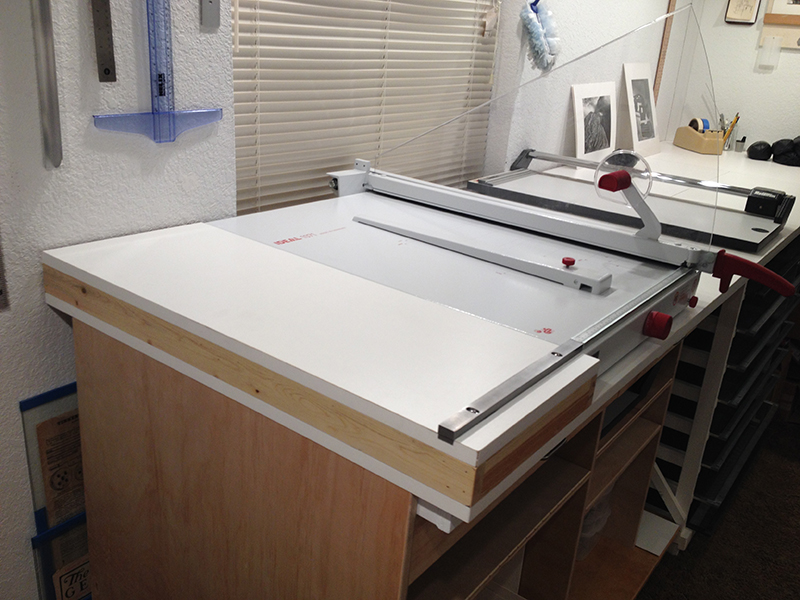 That is where we are now. . . building our own clam shell portfolio boxes.  This required a little updating to the work room.  Building another cabinet to hold a board shear, acquiring a suitable shear and stocking up on supplies.  Did I mention learning another trade?  Here is one more I can add to the resume.