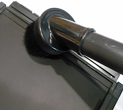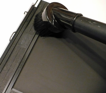We carry a large Harrison tent, but I hate using it. So, we also carry spring clips, small nails, a hammer, tape and blackout material to cover windows as needed. We can nearly always find a bathroom or other room that is easily transformed into the temporary darkroom for film handling. We also carry a small folding table which comes in handy at times. Dust is always a problem when loading film. We carry a small field service vacuum, see the BLOG entry titled “DUST. . . A Four Letter Word!” Every holder is vacuumed, inside and out, every time we reload.
