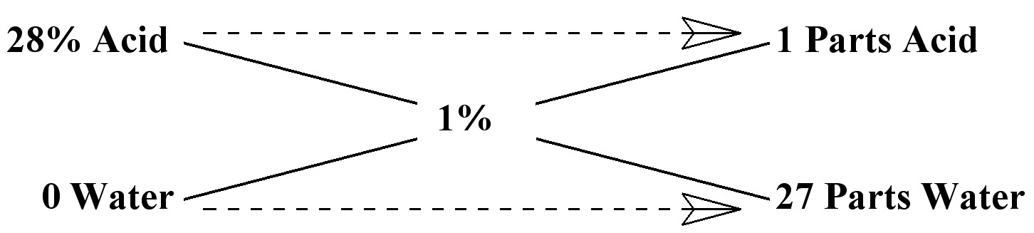 You will find that if you mix 1 unit of 28% Acid with 27 units of Water you will get a 1% solution for your stop bath. Remember, we are working with ratios and the Units can be anything desired, as long as they are the same Units. It could be a mixture of 1:27 ounces, gallons, milliliters, liters, whatever units you desire. You can change the values of X and Y if you want. Just keep in mind that you have to change both Units by the same amount. If you multiply the ratio of 1:27 by 2, you would have a ratio of 2:54 Units. You could also divide the Units for smaller volumes.